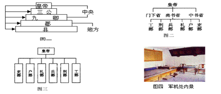 (1)图一、图二分别反映了中国古代哪一朝代的何种中央政治制度?与图一、二相比, 图三有何显著特点?(6分)