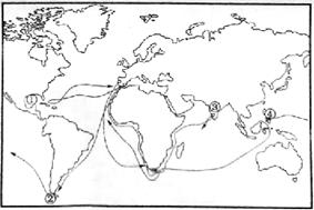 5、判断题 以下为15世纪末16世纪初的航海线路图,其中1497年至1498年葡萄牙航海家达?伽马进行航海探险的目的地是