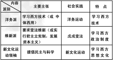 (1 )概括洋务派、维新派、新文化运动的领袖们“向西方学习”的主要主张、社会实践及各自特点。