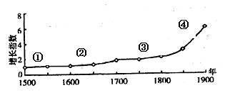1、判断题  下图是英国人均国民生产总值的指数变化(1500—1900年)示意图,从产业结构角度分析促进英国人均国民生产总值的指数在第④段变化的主要因素是?