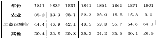 4、判断题 ? 英国工业革命改变了英国人的生活。读英国辑部门就业人口比例(%)表,从这组数据中不能提取的信息是?