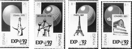 2、判断题 在1992年西班牙塞维利亚世界博览会开幕前夕,西班牙邮政部门发行了四枚纪念邮票(见下图),画面分别为曾经举办过世界博览会的城市。能够反映第一次工业革命成果的邮票是