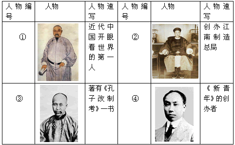 (1)以上四位人物分别代表中国近代史上的四个派别。在下面的横线上填上他们的姓名和所代表的派别。