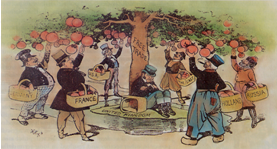 5、判断题 下图是20世纪初欧美国家报刊上的一幅漫画(图中大树意为自由贸易,树底下坐着的是英国,而正在采摘果子的为美、法、俄、荷等国)。下列对这幅漫画的解读,不准确的是
