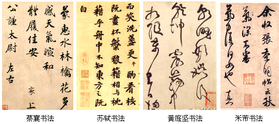 2、选择题 据《书林藻鉴》卷九记载:“(宋四家)蔡胜在度,苏 胜在趣,黄胜在韵,米胜在姿。”下列关于图中书法艺术的表述,正确的是: