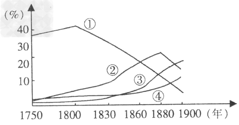 4、判断题 读《美、德、英、中在世界制造业产值比重的变化曲线图》,其中曲线③代表的国家是?