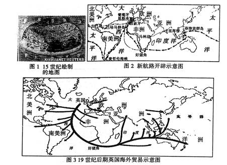 材料二?材料一中图1,它是15世纪欧洲人绘制的世界地图,当时的欧洲人认为世界就是欧洲、北非、亚洲等一些地方,一片广阔的陆地的尽头是万丈深渊……总的来说,这些图片资料集中反映了世界从彼此割裂、相互子解、相对欠缺到日益连成一个有机整体的过程。