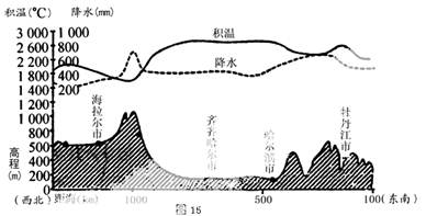 (1)牡丹江市的积温值高于海拉尔市的原因是 。(4分)