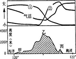 1、单选题 如图下部为某岛屿沿回归线的地形剖面图,上部是该区相关地理事物沿线变化图,回答问题:1.岛屿名称2.对该岛生活、生产危害最大的两种自然灾害是3.①、②两条条曲线可能代表的分别是