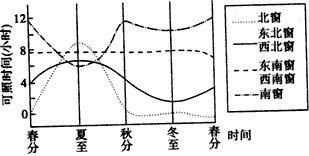 2、单选题 下图是30。N地区几种朝向的窗户内每天可能受到太阳直接照射的时间曲线图。读图,回答1—2题。