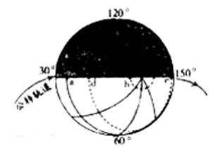 小题1:读图,图示地球是顺时针运动,应是从南极上空看到的地球公转运动。图中的极点为南极点,晨昏线过极点,说明是二分日,若是秋分日,则昏线 ab的移动方向向东,A对。地球公转速度加快,D对。有两个正确答案,所以不可能。只能是春分日,此日后,昏线ab向西移动,A错。太阳直射点向北移,图中a地纬度低,c地纬度较高,两地都在南半球,所以c地昼长将短于a地,B对。b地在极圈附近,没有出现极夜现象,C错。此后地球靠近远日点,地球公转速度逐渐变慢,D错。