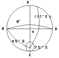 (1)根据图中的中心点O(150S,1350E),可知赤道位于该中心点与北侧的第一点中间位置,而南极点为该中心点南侧偏75°的位置,即距离C点15°的位置,这就可以画出450E经线,1650E.经线,00纬线,750S纬线的位置。