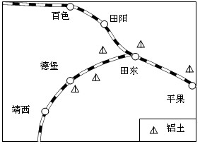 2、单选题 2010年7月23日11时,广西壮族自治区田东至德保铁路开通运营仪式在德保火车站举行,该铁路全长72.6千米,桥隧比重56%,铁路沿线铝土矿储量达28.2亿吨。结合下图完成1~2题。