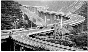 3、填空题 2012年4月28日正式通车的四川雅安一西昌高速公路,穿越了龙门山构造带及安宁河断裂带,沿线多高山、断崖、陡坡、溶洞、深谷。雅西高速公路全长约240千米,其中特大桥23座,大桥168座,隧道25条。桥隧长度占全线总长的55%。下图是雅西高速公路汉源流沙河大桥景观图。读图回答问题。