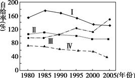 小题1:结合三大地区及全国的能源自给率概况,Ⅳ能源自给率始终最低,判断为东部地区;上个世纪能源输出最多的为Ⅰ,判断为中部(长期以来,东部能源缺乏,主要靠中部输入);而目前能源自给率不断上升的Ⅲ判断为西部(随之西气东输、西电东送等工程发展,西部的能源开发、输出增加);故选C。