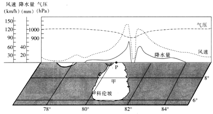 【小题1】读图,图示天气系统中心气压低,降水很少,风力很小,应是飓风天气系统。是北半球强烈发展的热带气旋。天气系统水平气流呈逆时针旋转辐合,A错。气压最低区域降水量较小,B对。该地夏季有飓风灾害,受夏季西南季风影响,天气系统移动方向为东北,C错。P地受低压中心影响,近地面风向为西北风,D错。