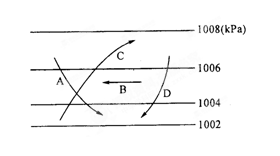 本题解析:本题考查风的形成。大气的水平运动称之为风,形成风的直接原因是水平气压梯度力,水平气压梯度力垂直于等压线,并指向低压。在高空风向只受到水平气压梯度力和地转偏向力的影响,风向最终和等压线平行;在近地面风向还要受到摩擦力的影响,风向最终和等压线斜交。北半球地转偏向力向右,风向最终位于水平气压梯度力右侧。所以本题选择D选项。