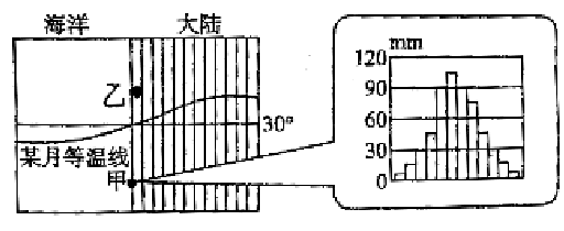 2、单选题 读图,回答下题:1.图示中某月最可能是2.甲地仅位于3.关于乙地气候类型的成因与分布规律的叙述,正确的是