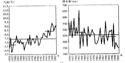5、单选题 下图是我国华北地区1954-2002年气温与降水变化示意图,完成下列问题。1.近年来华北地区水旱灾害严重是因为2.图中反映华北地区近年来气候