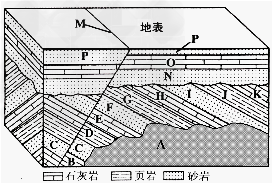 2、单选题 地层剖面记录了地壳发展、演化过程中发生的一系列事件,石灰岩、页岩、砂岩分别是深海、浅海、河湖沉积的产物。读地层剖面示意图回答1~2题。