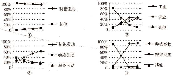 1.①时期劳动力主要从事狩猎采集,出现在人类社会的早期;④时期从事种植畜牧业的劳动力比重不断增大, 表示农业文明时期;②时期从事工业活动的就业比重较大, 表示工业文明时期;③时期知识劳动所占比重大,表示后工业化阶段。