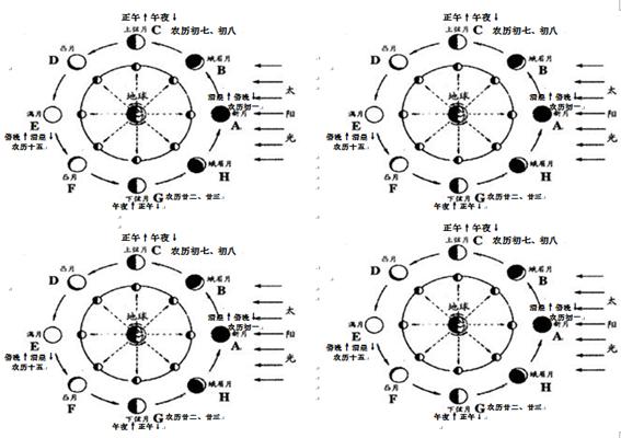 随着月亮每天在星空中自西向东移动一大段距离,它的形状也在不断地变化着,这就是月亮位相变化,叫做月相。“人有悲欢离合,月有阴晴圆缺”,这里的圆缺就是指“月相变化”:在地球上所看到的月球被日光照亮部分的不同形象。由于月球本身不发光,在太阳光照射下,向着太阳的半个球面是亮区,另半个球面是暗区。随着月亮相对于地球和太阳的位置变化,就使它被太阳照亮的一面有时对向地球,有时背向地球;有时对向地球的月亮部分大一些,有时小一些,这样就出现了不同的月相。每当月球运行到太阳与地球之间,被太阳照亮的半球背对着地球时,人们在地球上就看不到月球,这一天称为“新月”,也叫“朔日”,这时是农历初一。过了新月,月球顺着地球自转方向运行,亮区逐渐转向地球,在地球上就可看到露出一丝纤细银钩似的月球,出现在西方天空,弓背朝向夕阳,这一月相叫“蛾眉月”,这时是农历初三、四。随后,月球在天空里逐日远离太阳,到了农历初七、八,半个亮区对着地球,人们可以看到半个月亮(凸面向西),这一月相叫“上弦月”。当月球运行到地球的背日方向,即农历十五、十六、十七,月球的亮区全部对着地球,我们能看到一轮圆月,这一月相称为“满月”,也叫“望”。满月过后,亮区西侧开始亏缺,到农历二十二、二十三,又能看到半个月亮(凸面向东),这一月相叫做“下弦月”。在这一期间月球日渐向太阳靠拢,半夜时分才能从东方升起。又过四五天,月球又变成一个蛾眉形月芽,弓背朝向旭日,这一月相叫“残月”。当月球再次运行到日地之间,月亮又回到“朔”。月相就是这样周而复始地变化着。如果用月相变化的周期(即一次月相变化的全部过程)来计算,从新月到下一个新月,或从满月到下一个满月,就是一个“朔望月”,时间间隔约29.53天,中国农历的一个月长度,就是根据“朔望月”确定的。