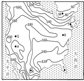 本题解析:1.根据北美洲部分地区某种动物的种密度等值线分布图,可知:R属于(160,180),Q属于(180,200),K属于(140,160)或(180,200),H属于(160,180)或(200,220),综合可知该种动物的种密度可能相等的两地是H和R。