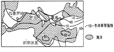 5、单选题 读“地中海地区冬雨率等值线图”,回答下面下列小题。(注:冬雨率为冬季降水量占全年降水量的百分率,单位:%)