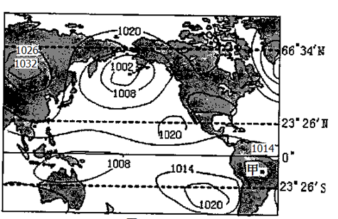 【小题1】甲位于南半球,此季节南半球海洋为高压,陆地为低压,气压差为6百帕,甲位于低压中心,故甲的气压应低于1008百帕,选A正确。