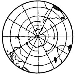 5、单选题 下图是以南极点为中心的半球图,图中阴影部分表示地球上某种资源的分布,箭头表示洋流。根据图中信息,回答1—2题。