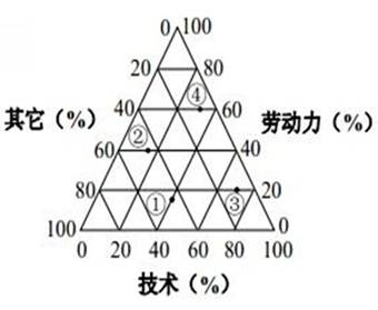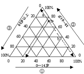 本题解析:试题分析:三角形统计图是采用数字坐标形式来表现多项地理要素的数字信息图像。三角形坐标图常用百分数(%)来表示某地理事物局部与整体的结构比例。三条边分别表示三个不同的地理要素,三个顶点可以看作是三个原点。三角形统计图的适用范围比较广,可用来表示三个项目所占整体的百分比。我们常遇到的类型有人口年龄结构的比重、三大产业构成比重、工业区位因素的影响程度,是近年来地理高考的一个重点中的重点。下面以人口为例说明: