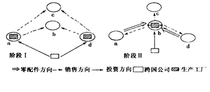 2、单选题 下图是某跨国公司工业投资地域变化图,a、d两国均为发达国家,b、c两国均为发展中国家。读图完成题。1.在阶段Ⅰ,影响跨国公司投资设厂的主导因素是2.在阶段Ⅱ,影响跨国公司投资设厂的主导因素是3.跨国公司投资的地域变化,说明了