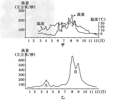 (2)河流乙一年有两个汛期,其中A汛期是_________补给形成的,B 汛期是________补给形成的。该河流径流终年存在,可知该河流至少有____种补给类型。