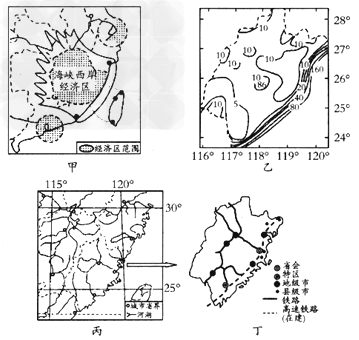 下图分别为海峡西岸经济区示意图(甲),福建省全年大风天数分布示意图(乙),某区域图(丙),福建省城市、交通线的分布图(丁)。?(1)简述丙图中水系的主要特征。