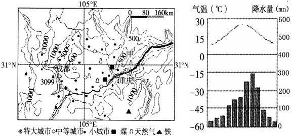 下左图为四川盆地等高线略图,下右图是重庆市气温降水柱状图。材料二: