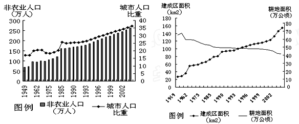 (1)读材料一图,左图中表示,非农业人口增加,即城市人口增加;城市人口比重增加。右图中表示建成区面积增加,即城市用地面积增加。这是城市发展的基本特征。