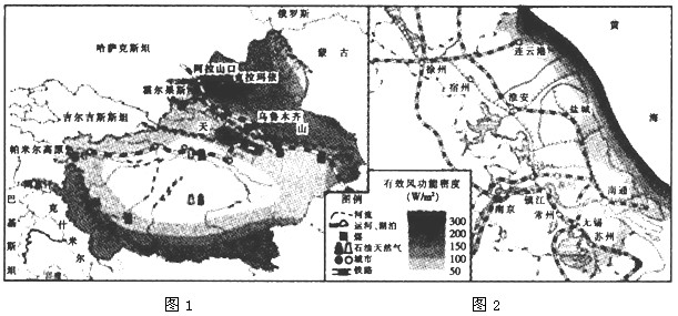 (2)新疆风能资源主要分布在天山及其以北地区和昆仑山区。江苏省风能资源主要分布在东部沿海地区。