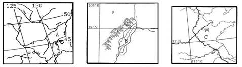 4、单选题 下列三图中分别标注了我国的A、B、C三个平原地区,判断回答问题。1.比较A、B、C三个平原地区,从农业角度来看,共同点是2.导致B所在区域图西部荒漠化速度快的主要自然原因是