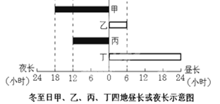 小题1:读图可知甲地的夜长是18小时,那么昼长是6小时,与乙地等长;丁地冬至日的昼长为24小时,应为南极圈以南地区,其自转的线速度最小;冬至日,我国各地日出东南方;乙地昼短夜长,应为北半球。故选A。