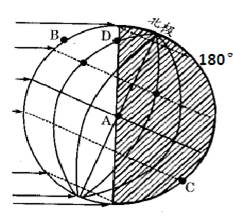 (3)确定地方时:在光照图中,太阳直射点所在的经线为正午12点,晨昏线所包围的白昼部分的中间经线为12点,晨线与赤道交点经线的地方时为6点,昏线与赤道交点经线为18点,依据每隔15?,时间相差1小时,每1?相差4分钟,先计算两地的经度差(同侧相减,异侧相加),再转换成时间,依据东加西减的原则,计算出地方时。