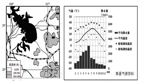 1、综合题 (14分)读我省局部地区示意图及省城南昌气候相关资料,回答下列问题。