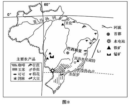 (1)位于巴西东部是巴西暖流,首都巴西利亚的气候是热带草原气候,形成热带草原植被。亚马孙流域是热带雨林气候,自然环境恶劣导致人口稀少,经济落后。