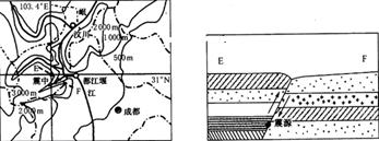 1、单选题 北京时间2OO8年5月12日14时28分,四川汶川发生里氏8.0级地震。左下图为这次地震震中及周围地区等高线地形图,下图是经过震中EF线所作的地质剖面图。读图回答