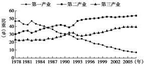 材料二 下列为1978~2007年台州三次产业增加值结构演变示意图