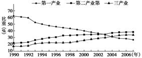 材料三 下列为1990~2007年台州三次产业就业结构演变示意图