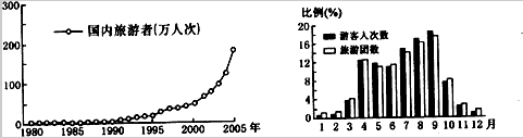 4、单选题 ? 青藏铁路通车标志着西藏旅游进入了一个新时代。读下列有关青藏铁路通车前后旅游业发展变化图及游客月份分配图,回答1—2题。