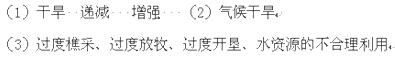 (3)土地荒漠化是由人为原因和自然原因综合作用,自然因素主要是指异常的气候条件,特别是严重的干旱条件,由此造成植被退化,风蚀加快,引起荒漠化。人为因素主要指过度放牧、乱砍滥伐、开垦草地并进行连续耕作等,由此造成植被破坏,地表裸露,加快风蚀或雨蚀。