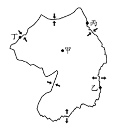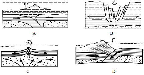 【小题1】图示板块为太平洋板块,甲地处在板块内部,A错误;乙地处在印度洋板块和太平洋板块的交界处,是生长边界,为海岭,B错误;丙地处在消亡边界,C错误;丁处位于于消亡边界,为海沟,D正确。