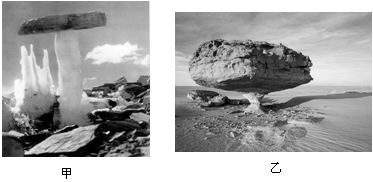 B.甲地冰川作用显著,冰川将漂砾带至冰柱上沉积而形成