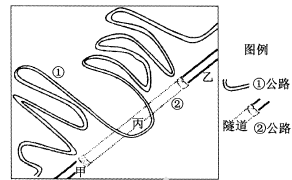 小题1:①公路曲折,弯道多,应该是在山区,等级低,可能是乡村公路。②公路平直,遇山修隧道,坡度小,说明等级高,应该是高速公路;甲乙两地位于同一隧道两端,相对高度很小;高速公路要求高,单位距离造价很高;丙处有隧道,应是山地。故选A。